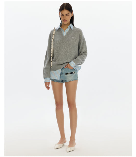Color-block embroidered V-neck long-sleeve argyle sweater