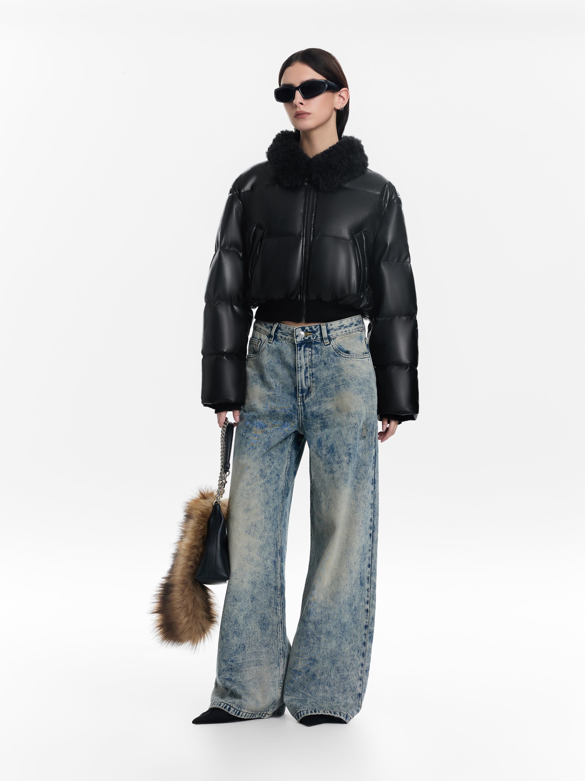 Black Short Glossy Down Jacket with Fur Collar